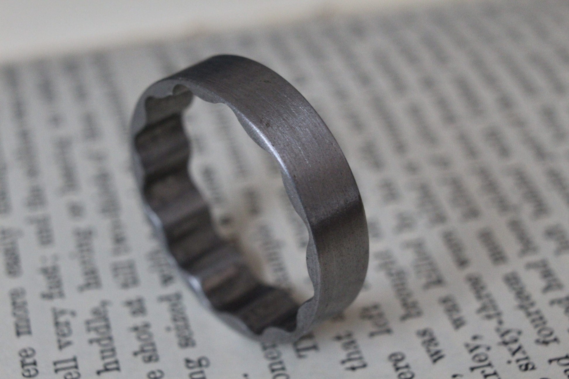 This is a ring upcycled from a 19mm mechanics socket. Due to it's ridged insides, it is very comfortable. The finish on the ring is a brushed finish. Being made from a socket, the steel is a high grade tool Steel and its very strong and durable.