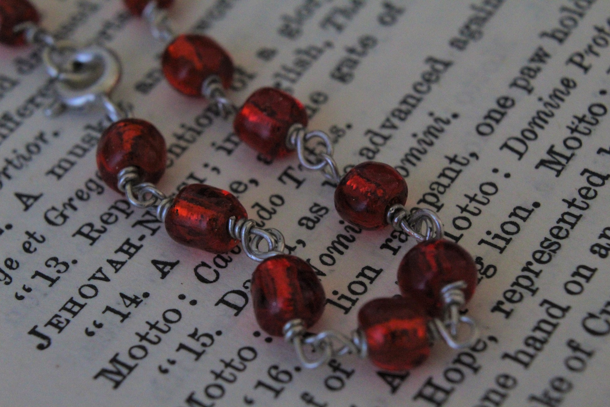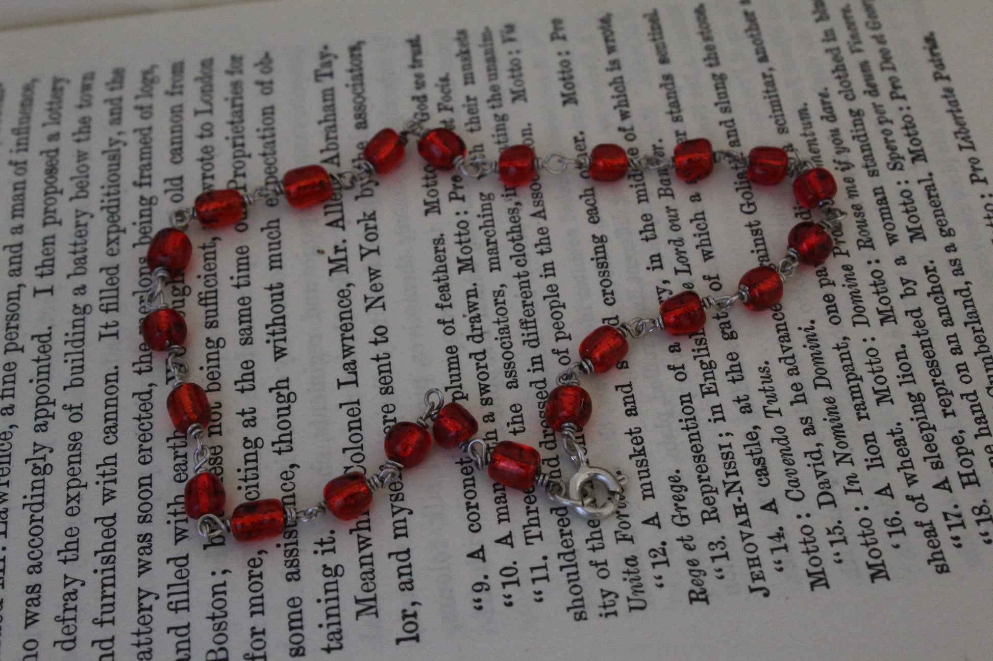 the bracelet is 21.5cm long {8.46 inches}. the beads a red glass that are 4mm in diameter and has a lobster catch